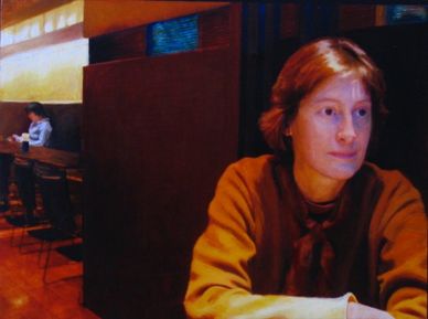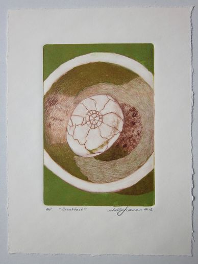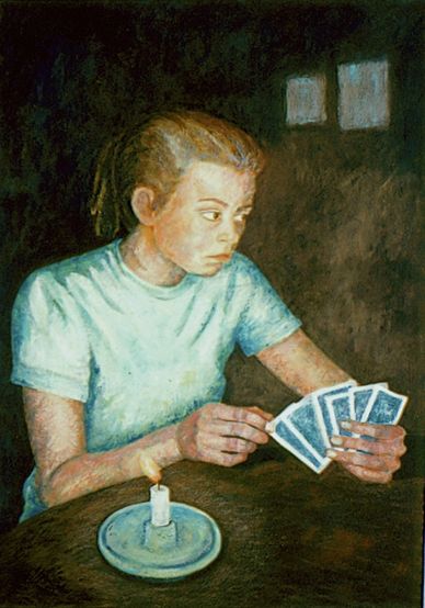 Outside of folding book: prints of 2 paintings on paper, ribbons, collaged on cardboard
